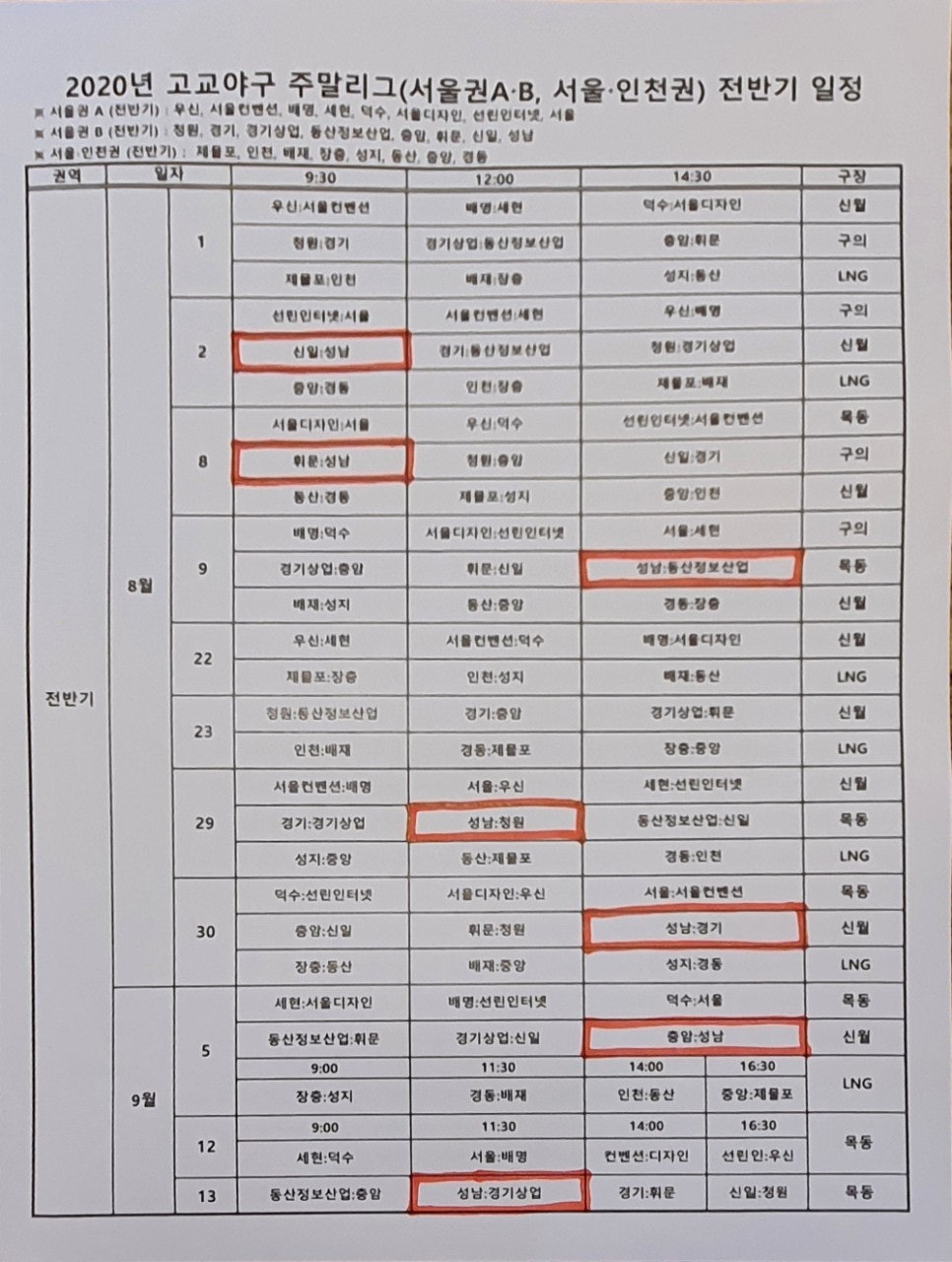 고교야구 전반기 주말리그 일정표